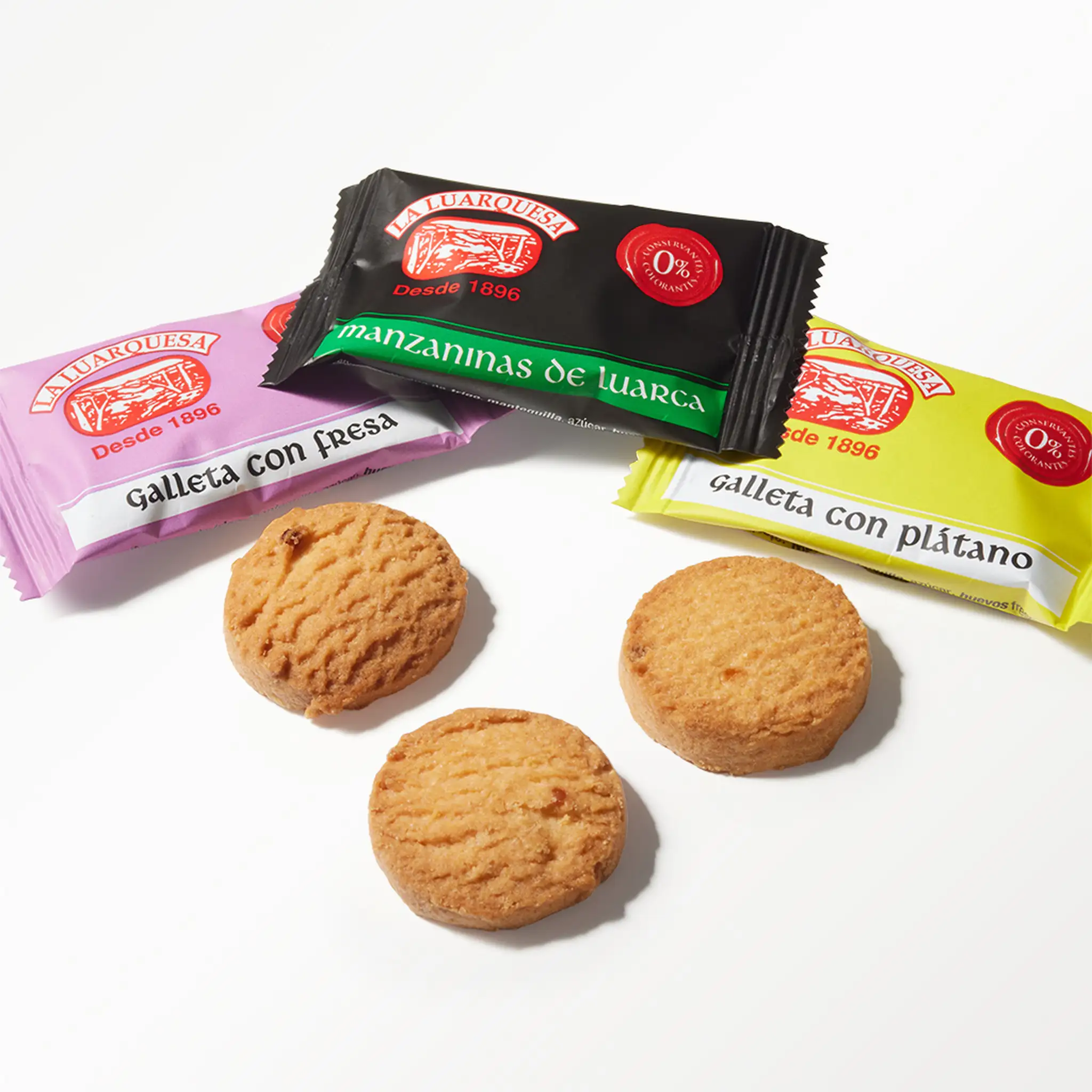 Galletas con fresa. Atrevida formulación incorporando el sabor explosivo de la fresa, en base al sabor de la mantequilla siempre presente en La Luarquesa.