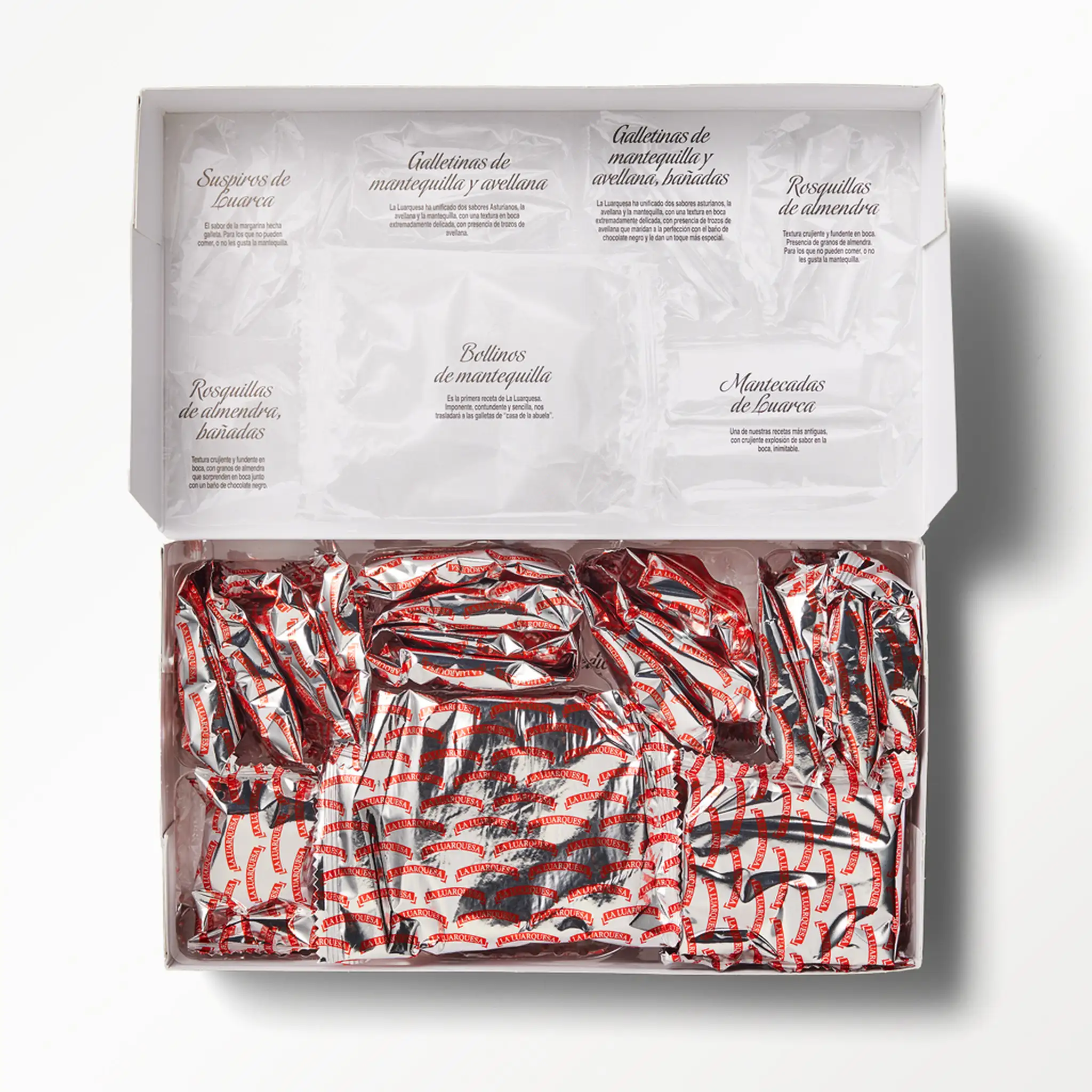 Contenido: Mantecadas de Luarca, Rosquillas de almendra bañadas, Rosquillas de almendra, Bollinos de mantequilla, Suspiros de Luarca, Galletinas de mantequilla y avellana bañadas y Galletinas de mantequilla y avellana.